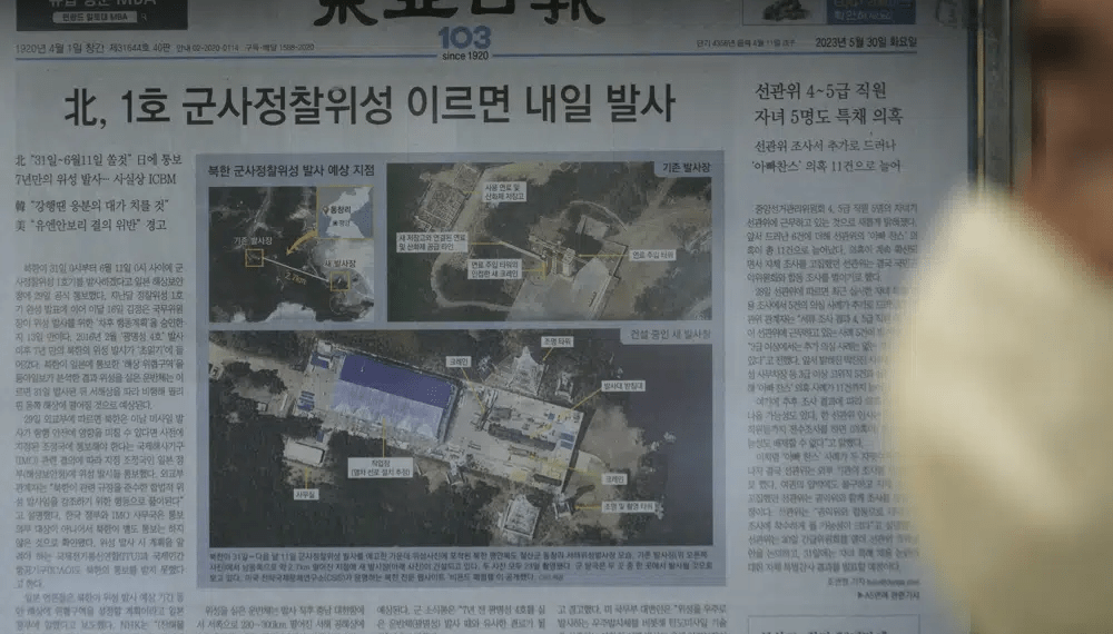 A local newspaper showing file images of the Sohae Satellite Launching Station in Tongchang-ri, North Korea, is displayed in Seoul, South Korea, Tuesday, May 30, 2023.